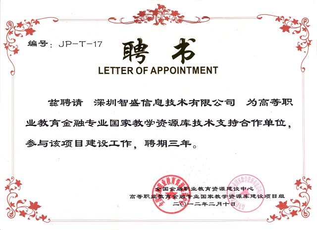 【金融資源庫項目組頒發(fā)給深圳市智盛信息技術(shù)有限公司的聘書】
