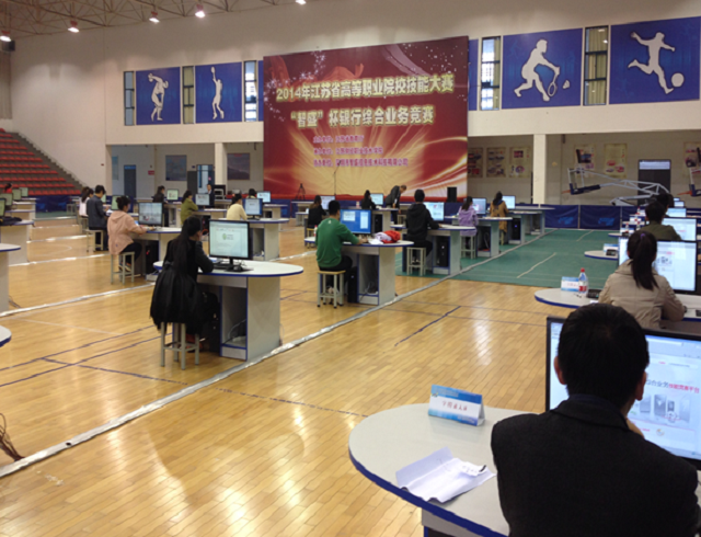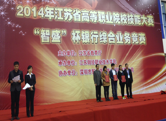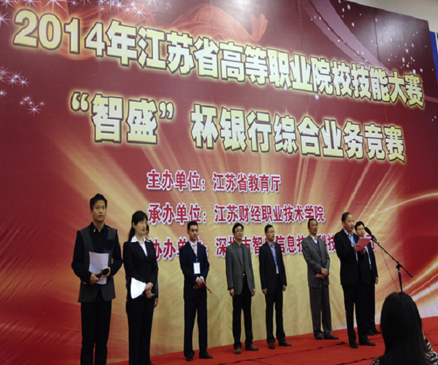 4月27日,2014年江蘇省高等職業(yè)院?!爸鞘ⅰ北y行綜合業(yè)務(wù)技能大賽在江蘇財經(jīng)職業(yè)技術(shù)學(xué)院訓(xùn)練館拉開序幕,來自全省的13所高職院校代表隊參與激烈角逐。大賽舉行開幕式后正式開始。本次大賽總裁判長是廣東番禺職業(yè)技術(shù)學(xué)院教務(wù)處處長楊則文教授,大賽仲裁長是全國金融職業(yè)教育教學(xué)指導(dǎo)委員會郭福春副秘書長,深圳智盛信息技術(shù)股份有限公司總經(jīng)理彭家源為裁判組成員,大賽組委會資格審查委員會委員為江蘇財經(jīng)職業(yè)技術(shù)學(xué)院副院長程淮中,出席開幕式的還有各參賽院校指導(dǎo)老師、領(lǐng)隊、參賽選手以及其它相關(guān)代表。