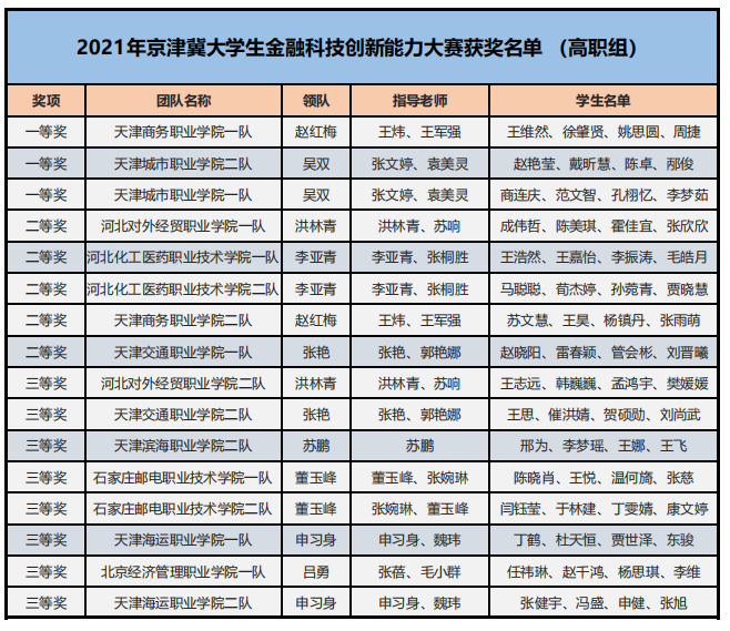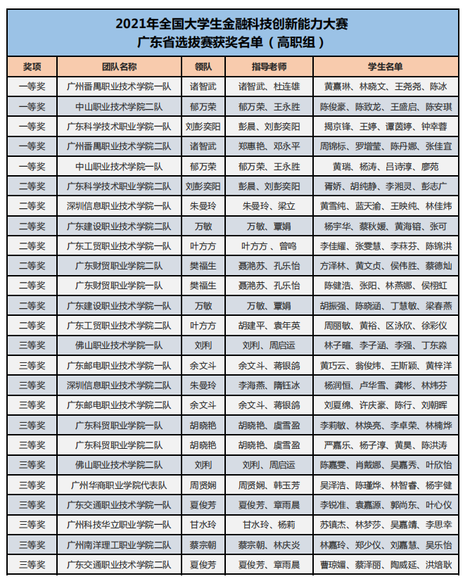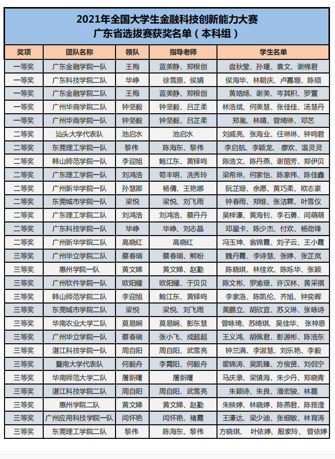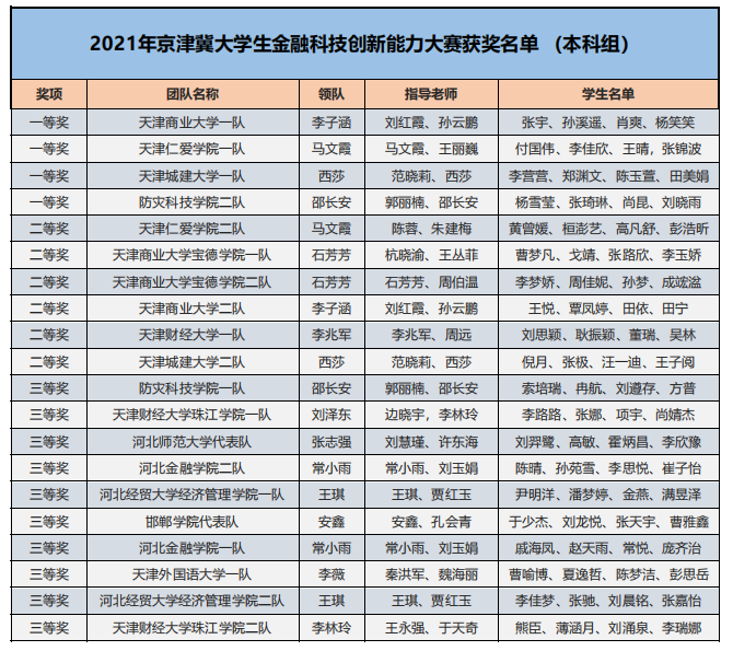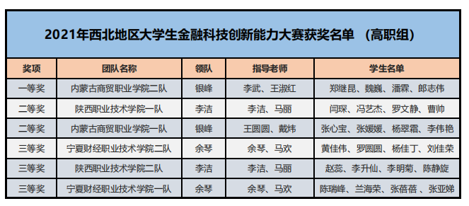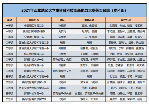 為了培養(yǎng)新一代青年大學(xué)生的金融科技創(chuàng)新能力,鼓勵對金融類專業(yè)人才創(chuàng)新意識和創(chuàng)新素質(zhì)的培養(yǎng)與訓(xùn)練,推進(jìn)本科與高職金融類專業(yè)“教、學(xué)、考、做、賽”五位一體的教學(xué)改革,推進(jìn)金融科技教育“工學(xué)結(jié)合、學(xué)做合一”;同時也是為適應(yīng)金融科技行業(yè)的蓬勃發(fā)展,對接金融科技企業(yè)人才需求,全面提升金融科技人才培養(yǎng),鼓勵創(chuàng)新意識、深化創(chuàng)新層次、激勵創(chuàng)新人才。在高等學(xué)校國家級實驗教學(xué)示范中心聯(lián)席會經(jīng)濟與管理學(xué)科組的指導(dǎo)下,2021年“智盛杯”各省市地區(qū)大學(xué)生金融科技創(chuàng)新能力大賽已成功舉辦。根據(jù)活動方案規(guī)定的獲獎比例,現(xiàn)將各地區(qū)賽的獲獎名單予以公布。