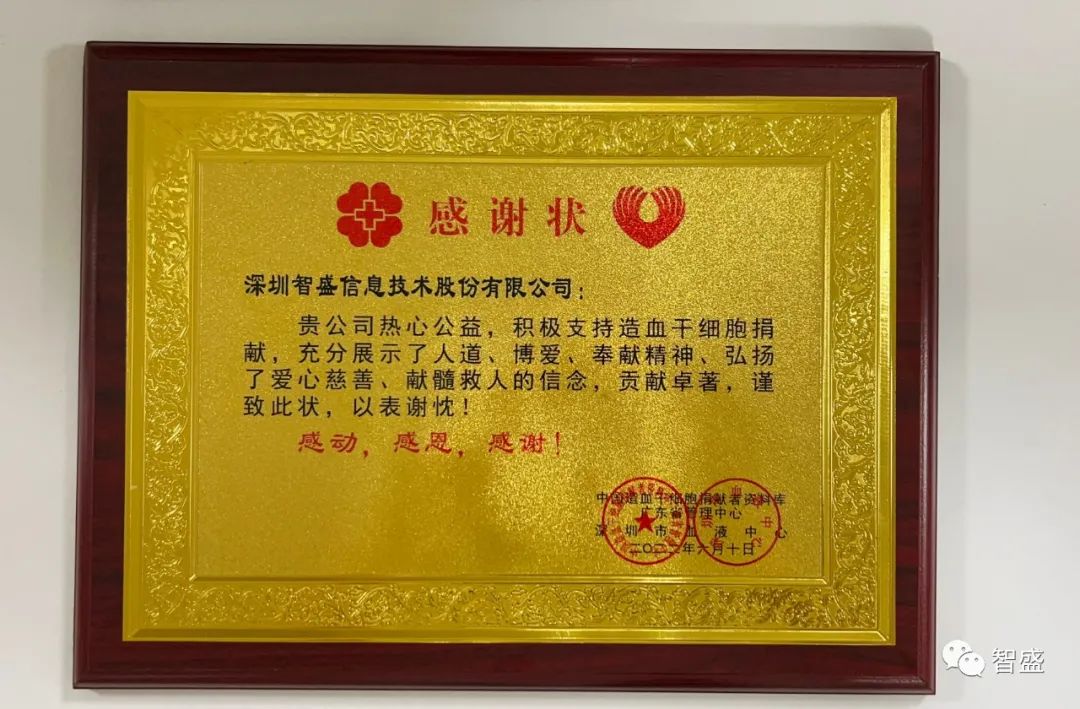 當(dāng)日,深圳市血液中心為韋宗杰和深圳智盛信息技術(shù)股份有限公司頒發(fā)了榮譽(yù)證書和感謝狀。